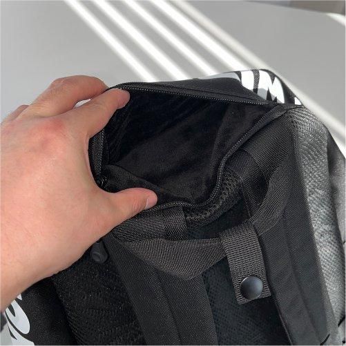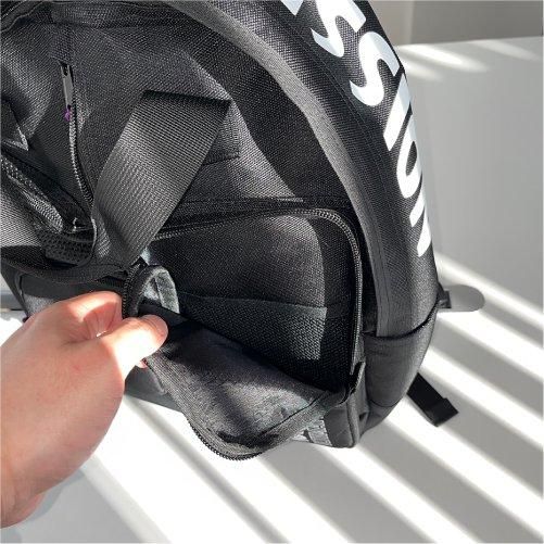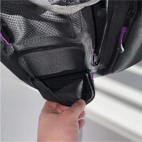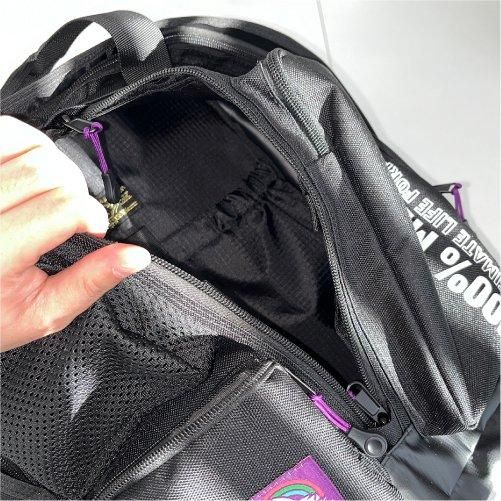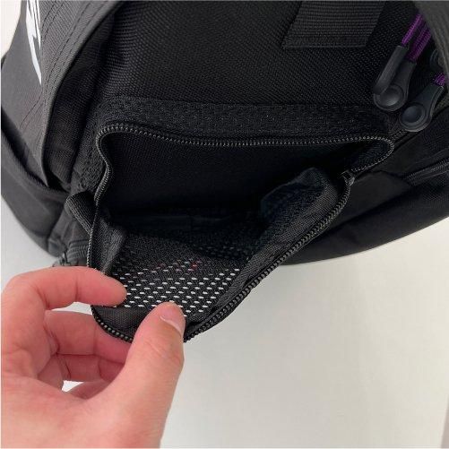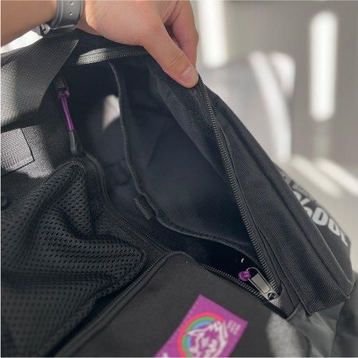 フロントパネルには大小3つの収納エリアを配置。左右のポケットはもちろん、フロント上部にもポケットと収納部分は多数。そしてフロント中央ポケットからメイン収納部分にアクセスでき、内側にも綿ファスナーで覆われたポケットにハンカチやメモなど薄めのアイテムならすぐ取り出しが可能。底面部分にはターポリン生地を使用。水や汚れなど簡単に拭くことができます。